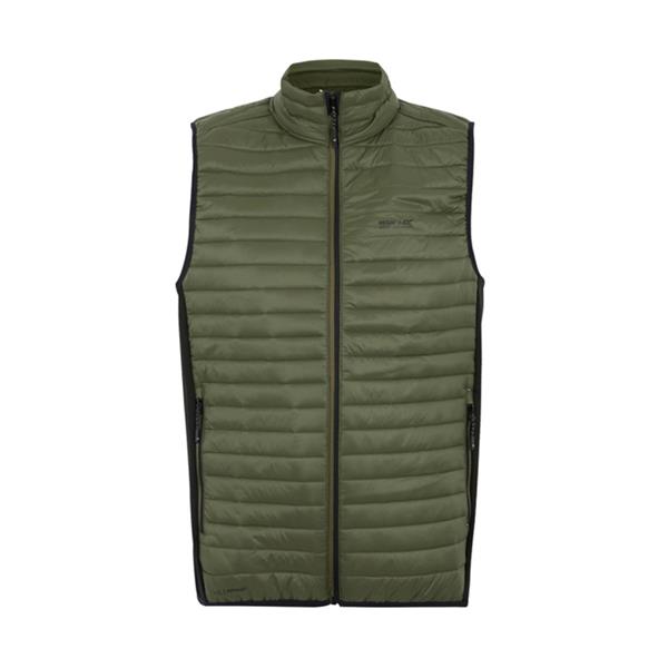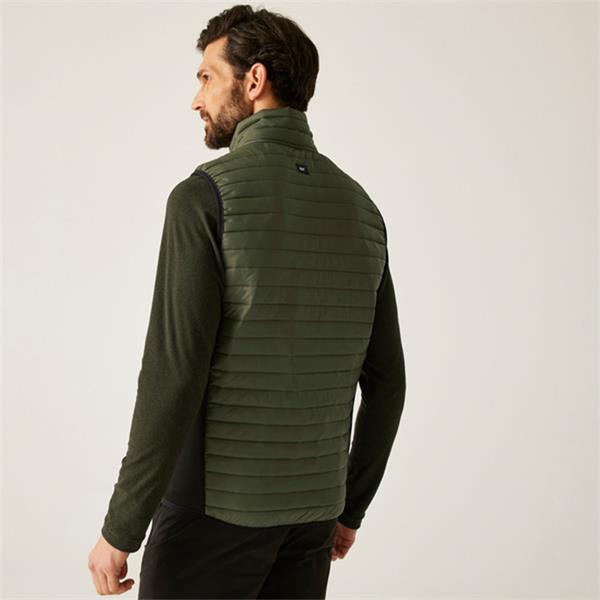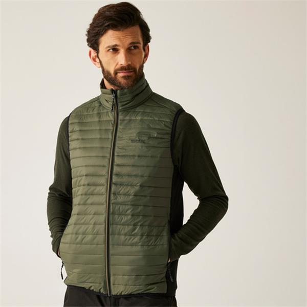 This Regatta Andreson Hybrid Bodywarmer, featuring the Olive Night (dark green) and black colourway, is a lightweight and protective gilet built with a hybrid construction that combines a durable, water-repellent 20d polyamide fabric on the main body with insulating Warmloft down-touch recycled synthetic filling (120gsm) to provide warmth without bulk, a filling which is also highly compressible for easy packing, while the side and underarm panels utilize Extol Stretch warm-backed knitted fabric (90% polyester/10% elastane, 235gsm) to ensure superior flexibility, freedom of movement, and additional insulation, making it ideal for high-energy activities; practical features include a full front zip, a durable water-repellent finish to the main body to shed light rain, two secure zipped lower pockets for essentials, and stretch binding at the armholes and hem to ensure a snug fit that helps seal in heat and keep out cold drafts.