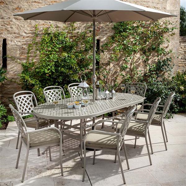Elevate your outdoor dining experience with the Beaumont 8 seat oval set, blending contemporary elegance with practicality. Crafted from durable cast aluminium, this furniture set boasts enduring attractiveness and strength. The table and chairs, adorned with a sleek lattice pattern, can grace your garden year-round, maintaining their beauty through all seasons. Accompanied by permeable Weatherready cushions, you can enjoy luxurious comfort during the warmer months, maximising your time outdoors.