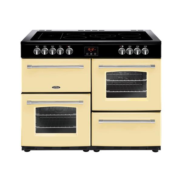The 110cm Belling Farmhouse Electric Cooker is AA rated and designed for efficiency and style. It features a 5-zone induction hob that heats the pan directly rather than the hob surface, making it nearly twice as fast as gas and 30% quicker than ceramic. Link+ cooking technology allows for flexible cooking, letting you control multiple zones at once—ideal for using griddles or larger cookware.