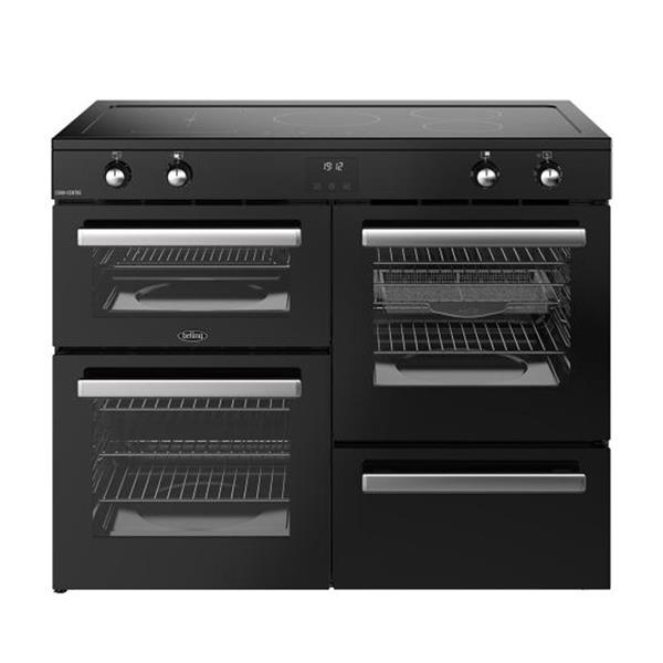 The Belling Cookcentre 110cm Electric Range Cooker combines a sophisticated black finish with expansive cooking capabilities, making it a versatile centrepiece for any modern kitchen. This A rated appliance features a five zone induction hob and a multi cavity design that includes a dedicated grill, a conventional oven, and a spacious main fan oven equipped with a specialised air fry function and tray. The inclusion of a touch control programmable Maxi clock timer and easy clean enamel interiors ensures that managing complex meals is both efficient and straightforward.