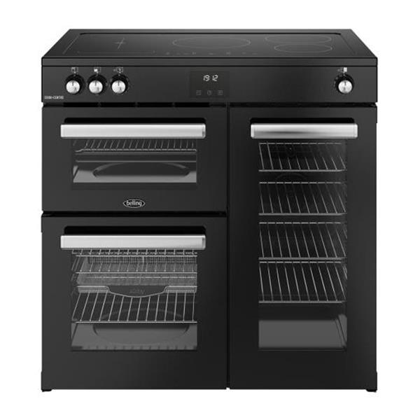 The Belling Cookcentre 90cm Induction Range Cooker in a sleek black finish is a high performance appliance designed to fit seamlessly into modern kitchens. This A rated electric cooker features a responsive five zone induction hob and three separate cooking cavities, including a dedicated 33 litre grill and a 60 litre main fan oven. For those who require extra space, the 81 litre tall fan oven is perfect for batch baking or large roasts. With the addition of an integrated air fry function and a touch control programmable Maxi clock, this cooker offers advanced technology to simplify meal preparation and healthy eating.