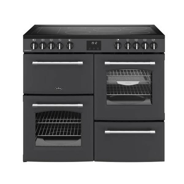 The Belling Farmhouse 100cm Electric Range Cooker in a striking anthracite finish combines traditional country styling with modern cooking technology. This A rated appliance features a versatile five zone ceramic hob with a dedicated warming area and three separate cooking cavities, including a 33 litre grill and a 60 litre conventional oven. The 64 litre main fan oven is enhanced with a specialised air fry function and tray, allowing for healthier meal preparation without needing extra countertop gadgets. With a touch control programmable Maxi clock and a built in storage compartment, this cooker is designed to handle the demands of a busy family kitchen with ease.