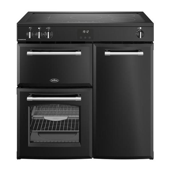 The Belling Farmhouse 90cm Induction Range Cooker in a classic black finish blends traditional country styling with advanced electric technology. This A rated appliance features a highly responsive five zone induction hob and three separate cooking cavities, including a dedicated 33 litre grill and a primary 60 litre fan oven. The standout 81 litre tall fan oven provides exceptional vertical space for multi level baking, while the integrated air fry function and specialised tray allow for healthier meal preparation without the need for additional countertop gadgets.