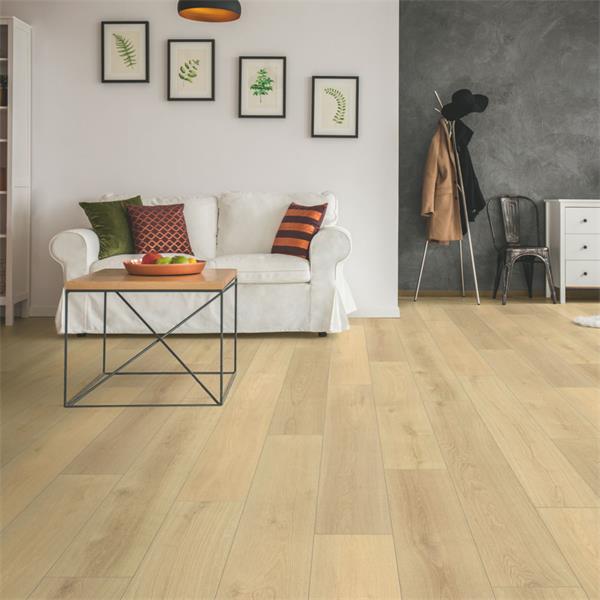 Blonde Montreux Oak laminate flooring offers a light, airy feel with its soft, natural colour and smooth wood pattern. This durable flooring is perfect for busy spaces, holding up exceptionally well under heavy foot traffic.