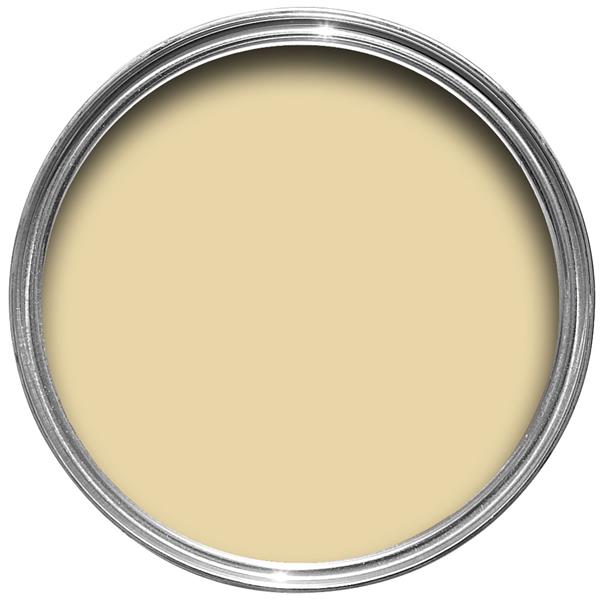 Farrow & Ball Bombazine No.9902 is a warm, subtle yellow tone from the Archive Collection, described as sitting between Farrow's Cream and Ringwold Ground. Its elegant name is taken from a twilled fabric made from worsted wool and silk, reflecting its gentle, refined character. The Flat Eggshell finish is an extremely durable, low-sheen satin (20% sheen) paint that is washable and highly scuff- and stain-resistant, making it a robust choice for interior wood and metal, such as kitchen cabinetry, skirting boards, and furniture, where a durable yet classic look is desired.