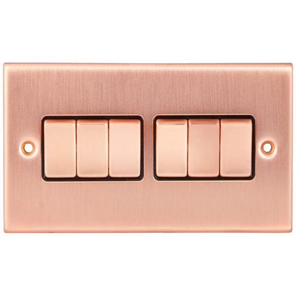 Achieve ultimate lighting control with the commanding Cesco Copper 6 Gang 2 Way Switch. This beautifully designed six-gang switch allows for independent management of six separate lighting circuits, with each circuit controllable from two distinct locations. The rich copper finish offers a unique aesthetic that complements both contemporary and traditional interiors, providing unparalleled lighting versatility and a distinct design statement for the largest and most sophisticated lighting installations.