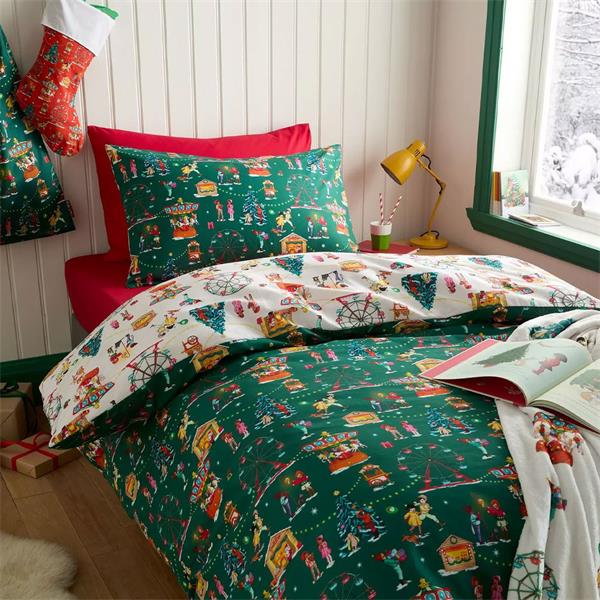 Step into the magic of Christmas with this enchanting bedlinen set against a deep evergreen backdrop. It features charming illustrations of a festive fairground, carol singers, and children visiting Santa's grotto, all inspired by the timeless joy of winter celebrations.