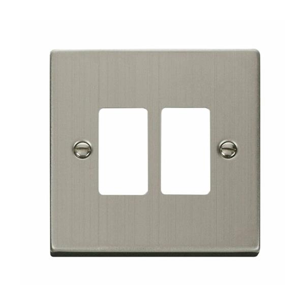 This Deco 2 Gang front plate in a sleek stainless steel finish offers a versatile and modern solution for your electrical installations. Measuring 88mm (H) x 88mm (W) x 8mm (D), it's designed to be used without a yoke, requiring a minimum back box depth of 25mm.