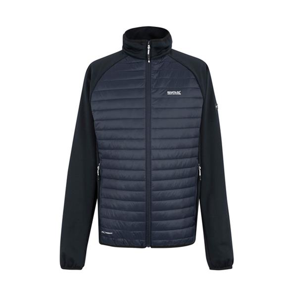 The Regatta Clumber Hybrid Jacket in Navy is a technical midlayer designed for active outdoor enthusiasts, utilizing a multi-fabric hybrid construction that strategically combines a lightweight 100% polyamide 20d body fabric (37gsm) featuring a durable water-repellent (DWR) finish for light rain protection, with Extol Stretch panels (90% polyester/10% elastane, 235gsm) placed in key areas to ensure maximum flexibility and unrestricted movement; the main body is insulated with 120gsm Warmloft down-touch insulation, a recycled, synthetic fill that provides cosy, bulk-free warmth while being easily compressible for convenient packing, with other features including a full-length zip, an inner zip guard, two zipped lower pockets, and stretch binding at the collar, cuffs, and hem to seal in heat, making it an ideal choice for hiking, trekking, or cool-weather layering.