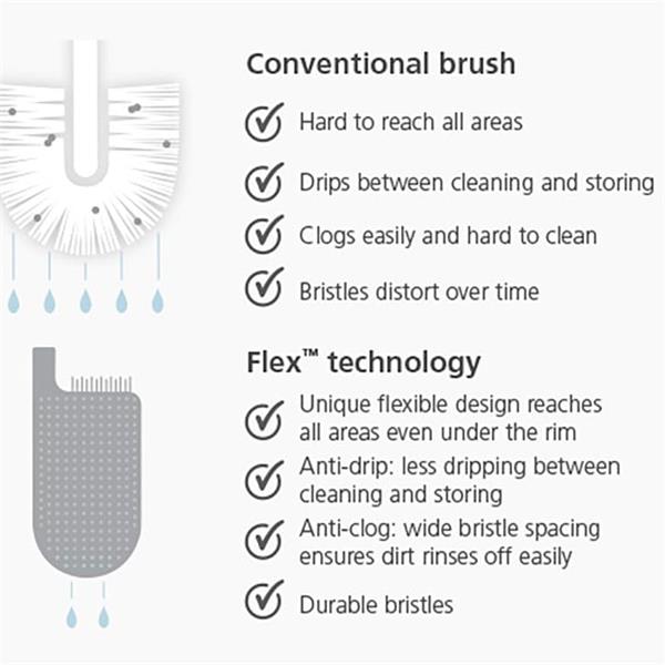 Tired of messy toilet brushes? The Flex Lite solves the problem. Its flexible, D-shaped head reaches every area, even under the rim, while widely spaced bristles prevent clogging and allow liquid to drain quickly. This means less dripping on the floor and a more hygienic clean. The brush also comes with a slimline holder for neat storage.