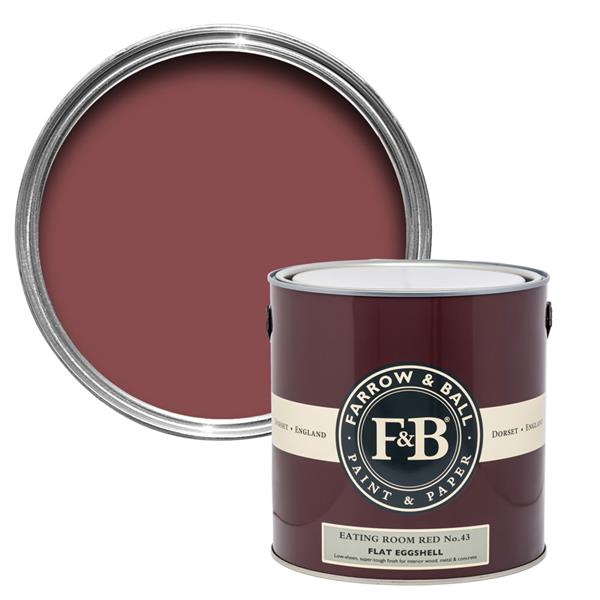 Eating Room Red No.43 is Farrow & Ball's most elegant red, a rich and deep burgundy shade with a wonderfully aged feel, achieved through blackened pigmentation. Named after the red damasks popular in 19th-century dining rooms, this colour reads almost like a saturated purple when compared to brighter reds, creating an intimate and sophisticated atmosphere. Choosing the Flat Eggshell finish gives this sumptuous colour a low sheen (20%) that is also incredibly robust. It is a super-tough, water-based paint, making it scrubbable, stain-resistant, and scuff-resistant—ideal for all interior wood and metal, including high-traffic areas like skirting boards, radiators, and kitchen cabinets.