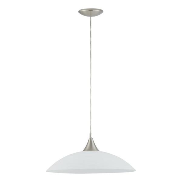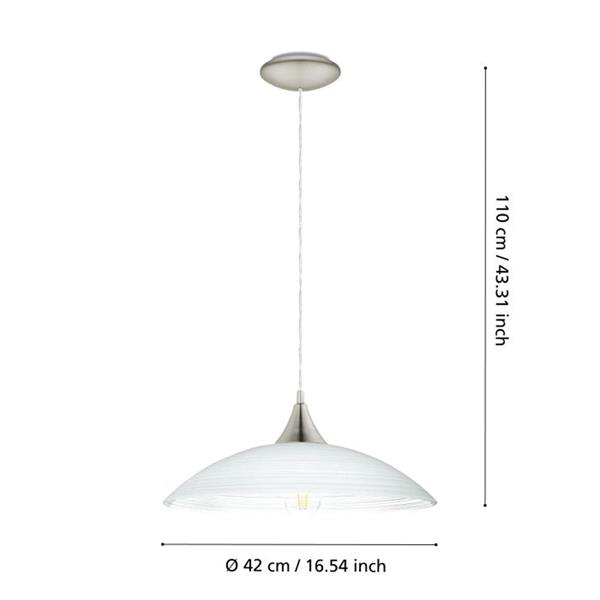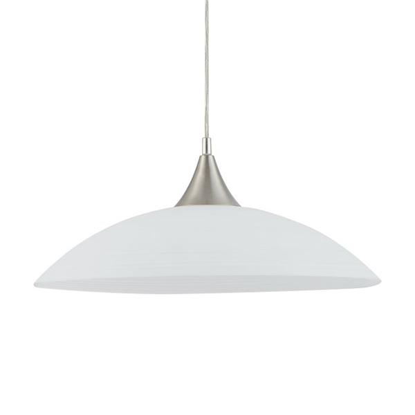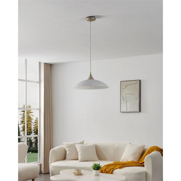 The Eglo LAZOLO pendant light in white offers a minimalist and elegant design, featuring a rounded, white satin glass lampshade paired with a sleek satin nickel canopy. This understated yet sophisticated fixture seamlessly blends with modern or "cottage-style" interiors, providing a soft, diffused ambient light ideal for creating a warm atmosphere in living rooms or gently illuminating dining tables. Typically standing at 110cm tall with a 42cm diameter, the LAZOLO requires one E27 lightbulb (not included) and is generally non-dimmable, focusing on delivering consistent, inviting illumination.
