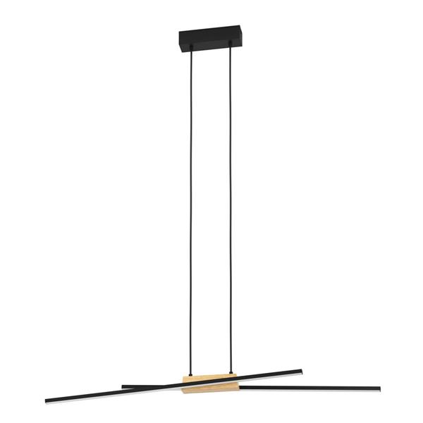 The PANAGRIA LED pendant light combines black metal with natural wood, featuring an oak-style finish. Two sleek black LED profiles are set at an angle on a compact wooden base. The integrated LEDs emit a warm white light with adjustable brightness, offering three levels controlled via a matching rotary dimmer on the wall. This pendant light complements a wide range of interior styles, making a striking focal point in the living room or a stylish addition above a long dining table.