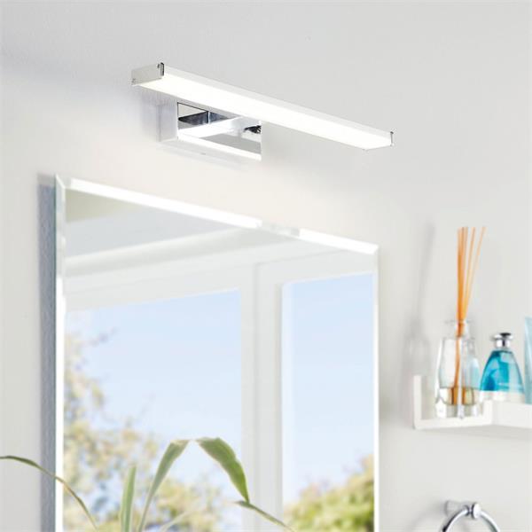 The PANDELLA 1 LED mirror light is a sleek and practical choice for modern bathrooms. Finished in chrome aluminium and silver plastic, its linear design and downward-facing light provide elegant illumination. With IP44 protection, it's perfectly suited for damp environments. The integrated LEDs, concealed behind a white diffuser, emit a bright, neutral white light, ideal for daily routines. Measuring 40 cm long, this wall light seamlessly enhances contemporary interiors when positioned above a bathroom mirror.