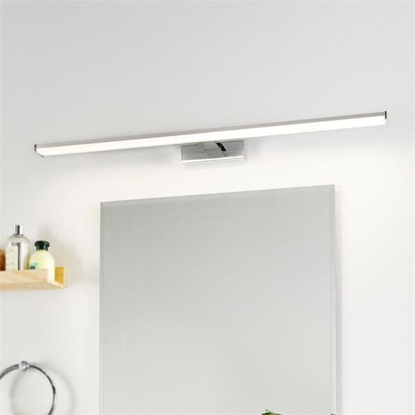 The PANDELLA 1 mirror light, 780mm, chrome silver, is the largest size in Eglo's sleek, modern LED bathroom lighting range, designed for comprehensive illumination over wider mirrors. It features a minimalist design with a chrome and silver aluminum and plastic body and a white plastic diffuser, ensuring it blends seamlessly with contemporary bathroom aesthetics. This wall-mounted fixture delivers a powerful 1700 lumens of neutral white light (4000K) from its 14W integrated, non-replaceable LEDs, and its IP44 rating confirms its suitability for splash zones in bathrooms.