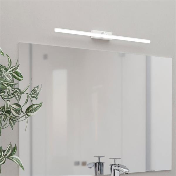 The VERDELLO LED mirror light boasts a contemporary design with a white plastic body complemented by small chrome accents. Its profile offers flexibility, swivelling up and down to direct the light. Integrated LEDs, diffused by a white plastic cover, provide adjustable illumination via a side switch, letting you select between a warm white and a cool white light. This 60 cm long wall lamp seamlessly fits into modern furnishings, providing stylish lighting above a bathroom mirror.