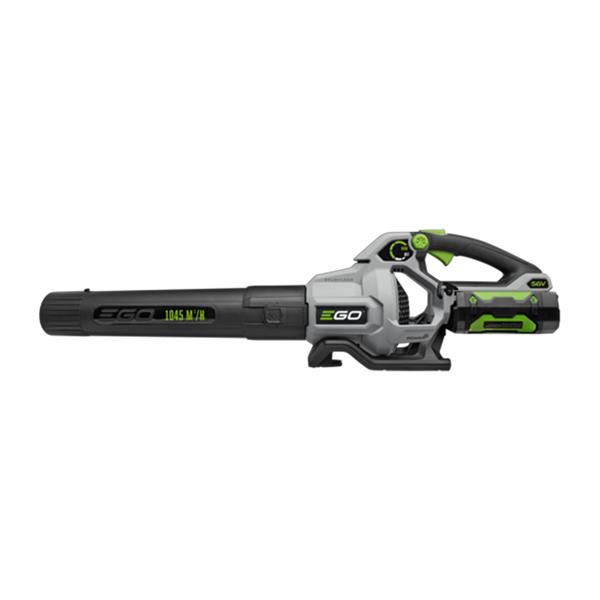 The EGO EGLB6150E is a 56V cordless, brushless leaf blower, sold as a "body only" unit, which means the battery and charger are not included. It's part of the EGO Power+ system, where all 56V batteries are interchangeable across the entire range of tools. The blower features a variable speed trigger with a "Boost" function, allowing for a maximum air volume of 1045m³/h and a max propulsive force of 18.5N. It comes with two interchangeable nozzles, a round and a flat one, for different tasks. The blower is designed to be lightweight and ergonomic, weighing approximately 2.15 kg without the battery. It also has a cruise control feature to lock the speed for continuous use.