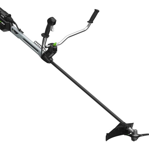 The EGO PRO X Line Trimmer / Brush Cutter with bike handle, is a professional-grade, battery-powered tool designed for heavy-duty use. It features a powerful 56V brushless motor, with the BCX3800 rated at 2kW brushless motor, providing performance comparable to a 35cc petrol engine but with zero emissions, less noise, and reduced vibration. The tool is known for its ergonomic design, including "bike-style" handlebars and an included harness, which allows for a comfortable, balanced, and controlled sweeping motion over large areas, reducing user fatigue. Key features include a lightweight yet strong carbon fiber drive shaft that won't bend and a variable-speed trigger with a safety lock-off. It comes with both a line trimmer head (with a manual wind bump feed) and a three-sided steel brush cutter blade, making it a versatile tool for tackling everything from fine grass to dense brush and even small saplings. The line trimmer heads typically have a cutting width of 38cm or 45cm, and can use line up to 3mm thick. The brush cutter blade has a 30cm cutting width. The unit is sold as a bare tool, meaning the battery and charger are purchased separately, but it is compatible with EGO's entire 56V ARC Lithium™ battery system, including their backpack batteries for extended run times.