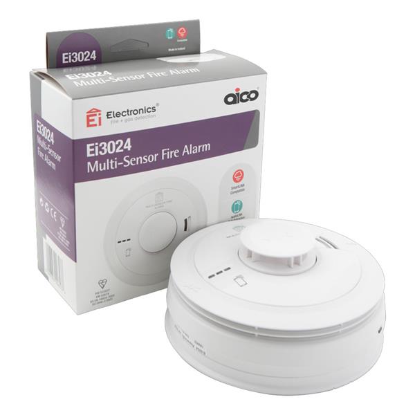 The Ei3024 Multi-Sensor Alarm provides superior fire detection with its intelligent dual-sensor technology, reacting much faster to all fire types than standard single-sensor alarms. It's designed to minimise false alarms thanks to a special chamber, an insect screen, and a unique dust compensation algorithm. Powered by mains electricity, it has a built-in 10-year tamper-proof lithium cell backup, providing up to six months of power in the event of an outage. The alarm can operate on its own or be interconnected with up to 20 other compatible devices, either by hard-wire or wirelessly with the optional EI3000MRF module. It also includes an AudioLINK feature for easy data download and a SmartLINK capability for live monitoring via the cloud portal.