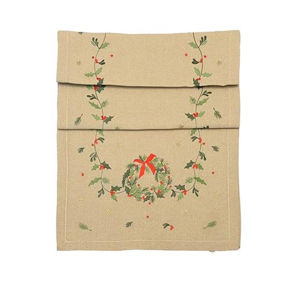 The Walton & Co Embroidered Wreath Trail Runner in Natural offers a beautifully sophisticated accent for your dining table. Set against a neutral, natural-toned fabric, the runner features a delicately stitched wreath trail, adding subtle texture and seasonal charm. This elegant piece is ideal for laying down the centre of the table to frame a festive display of candles or serveware, providing a refined and understated base to your home décor.