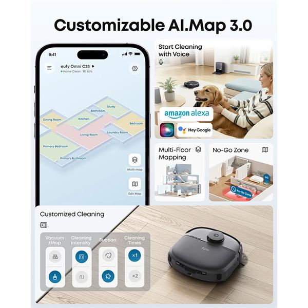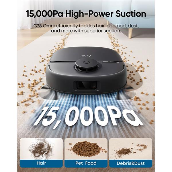 With an impressive suction power of 15,000 Pa, the Eufy C28a Omni Robot offers thorough cleaning on various surfaces, from carpets to hardwood floors. Experience unparalleled convenience with features that allow you to schedule cleanings and control your vacuum from your smartphone.
