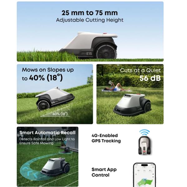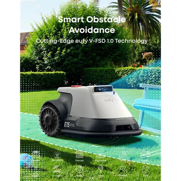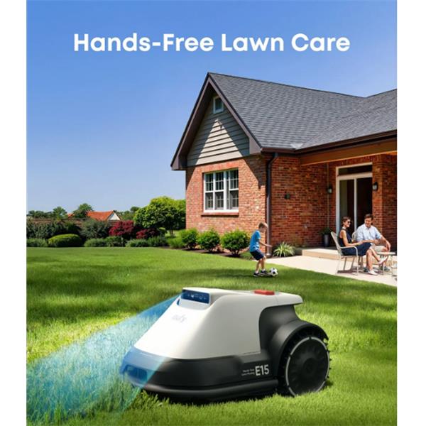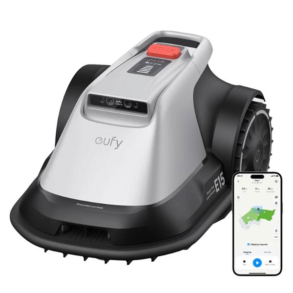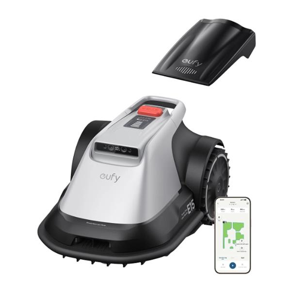 Introducing the Eufy E15 Robot Lawn Mower GPS & AI Camera in a sleek grey & black design, engineered for the modern gardener. This innovative appliance combines cutting-edge technology with user-friendly features, providing a hassle-free mowing experience.