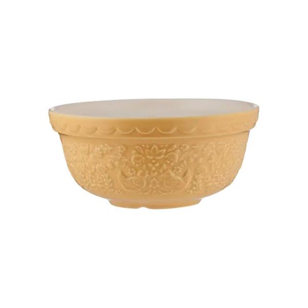 The Mason Cash Home To Roost S30 Yellow Mixing Bowl features intricately embossed, folk-inspired hen and cockerel motifs in a vibrant buttercup yellow, making it a cheerful and practical addition to any baker's kitchen. Crafted from durable, chip-resistant earthenware, this 21cm bowl is perfectly sized for smaller batches of pastry, cake, or cookie mixtures and features a patterned exterior designed for a secure grip during mixing.