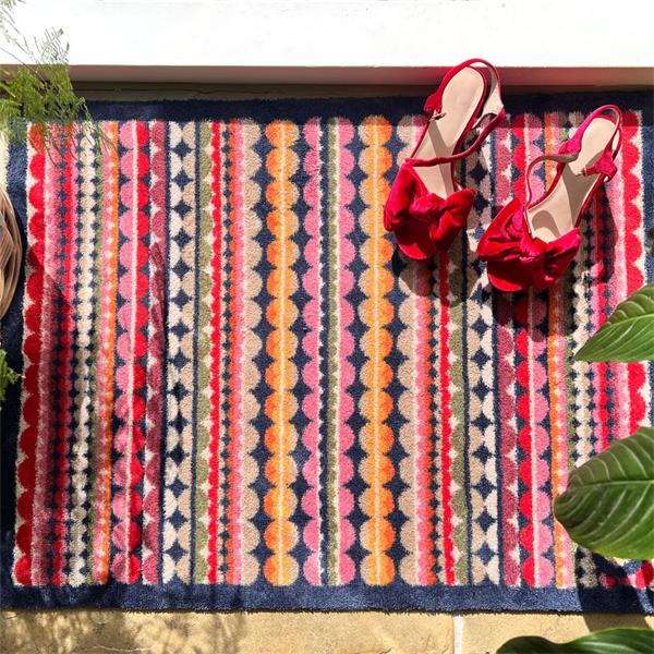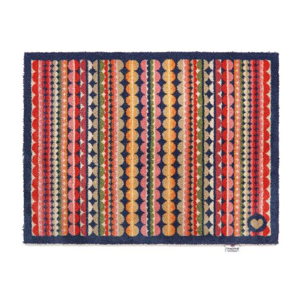 Hug Rugs are the ultimate eco-friendly, washable cotton mats—perfect for placing at your doorway to keep dirt at bay and protect your floors, all while adding a splash of colour and style to your space. The Beady Stripe design features a vibrant mosaic of lines and circles in shades of orange, pink, red, blues, green, and beige, all framed with a dark blue border.