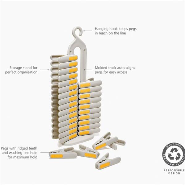The Joseph?Joseph PegStore 30-Piece Clothes Peg Set with Storage Stand is a smart and stylish laundry accessory designed to make drying clothes easier and more organised, featuring 30 durable, brightly coloured pegs that grip firmly yet release smoothly without damaging fabrics. Each peg has a comfortable, spring-loaded design for reliable performance in all weather conditions, while the included storage stand keeps them neatly contained when not in use and prevents them from scattering around the garden or laundry area. The stand’s upright shape and compact footprint make it easy to carry and store, and the set’s coordinated colours and thoughtful design add a cheerful, functional touch to everyday washing tasks. Whether you’re pegging out delicates or heavier garments, this set combines convenience, durability, and visual appeal in one efficient package.