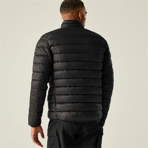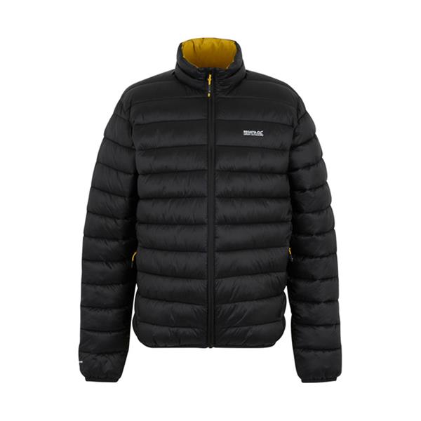The Regatta Marizion Padded Jacket in Black/Gold Flake is a contemporary, weather-resistant men's jacket designed for outdoor comfort and a sleek aesthetic, constructed from durable 100% polyamide lightweight 20d fabric (37gsm) with a durable water-repellent finish to shed light rain, while featuring 170gsm feather-free premium recycled synthetic down insulation that provides excellent, manageable warmth without the bulk or need for real feathers, thus making it an ethical choice; this regular-fit jacket incorporates a full front zip, a standard collar (no hood on this specific version), a warm polyamide lining, two zipped lower pockets for securing essentials, and practical stretch binding at the cuffs and hem to effectively seal in heat, combining performance with a fashionable padded design.