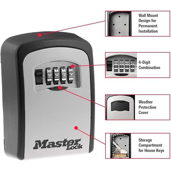 The Master Lock Key Box Large offers a secure and convenient solution for storing multiple keys or access cards. Built with a robust metal body and weather-resistant cover, it ensures long-lasting protection against tampering and the elements. The large internal capacity provides ample space, while the resettable combination lock allows for personalised security. Ideal for homes, offices, or property management, it delivers dependable key storage with easy access when needed.