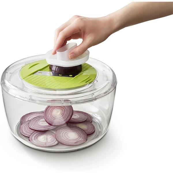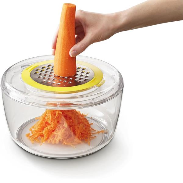 This multi-function set includes four interchangeable discs for a range of food prep tasks: a salad spinner, spiral cutter, slicer, and grater. Simply insert the disc you need into the lid. For safe use, it comes with a finger guard, and the non-slip base keeps it steady. All the accessories nest together neatly inside the large bowl for compact storage.
