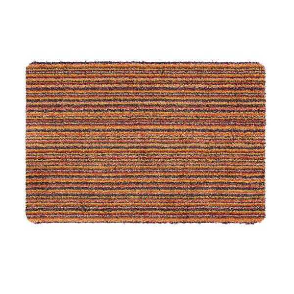 The Candy Spring Stripe mat combines functionality with aesthetic appeal, featuring a vibrant multi coloured pattern of rich orange, red, green, beige, cream, and subtle mustard tones. It serves as a durable yet stylish addition to any interior space.