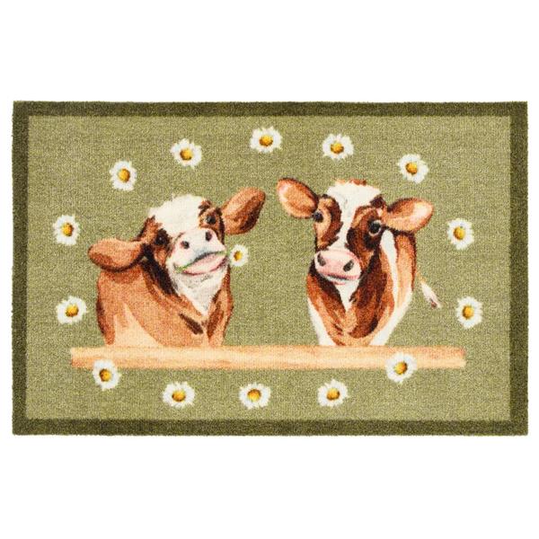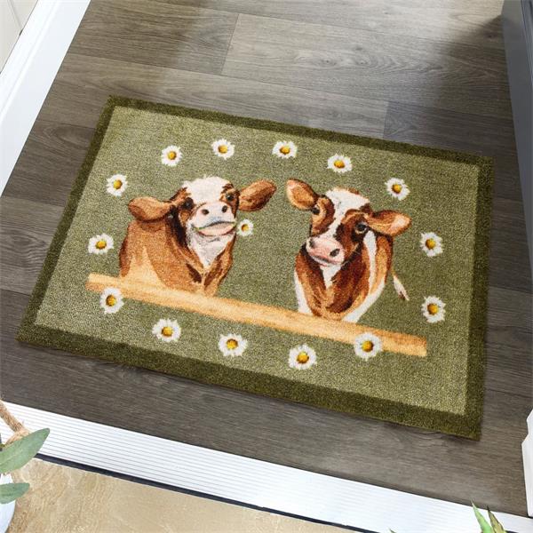 My Mat is the perfect all-purpose indoor mat, thoughtfully designed to help keep your floors clean and tidy. My Mat Daisy Cow features two cheerful cows framed by a ring of daisies on a soft green background, bordered in deep green.