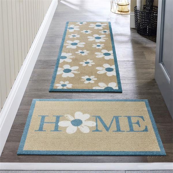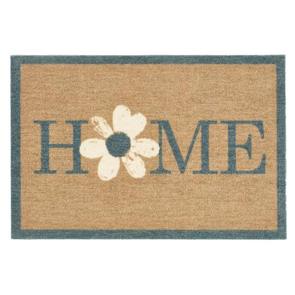 My Mat is the ultimate all-purpose indoor mat, designed to keep your floors clean and tidy. My Mat Flower Home features the word 'Home' in an elegant green font, with a white flower cleverly replacing the letter 'O', all set against a rich dark brown background with a coordinating border.