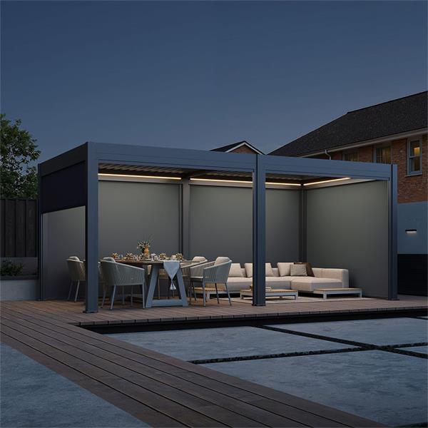 The adjustable louvered roof allows you to control sunlight and airflow, creating a comfortable environment at any time of day. Integrated LED lighting enhances the experience after dark, making gatherings, dinners, or quiet evenings under the stars truly special.