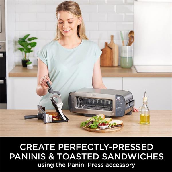 But that's not all – simply flip the appliance to transform into Grill mode, ideal for creating meals in minutes, from golden cheese on toast and loaded bagels to buttery croissants and café-style paninis. The Panini Press accessory lets you prepare toasted sandwiches with ease.