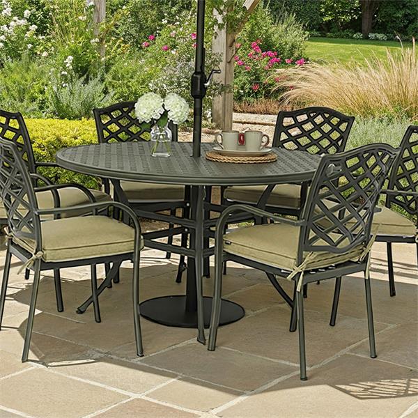 Introducing the Hartman Oakley Antique Moss Round 6 Seater Set With Parasol & Base, perfect for enhancing your outdoor space with style and comfort. This elegant garden furniture set combines functionality with aesthetic appeal, making it an ideal choice for alfresco dining or leisurely afternoons in your garden.