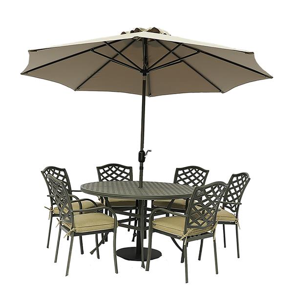 The antique moss finish lends a sophisticated touch, while the robust construction ensures durability through the seasons. This set comes complete with a parasol and base, providing essential shade on sunny days.