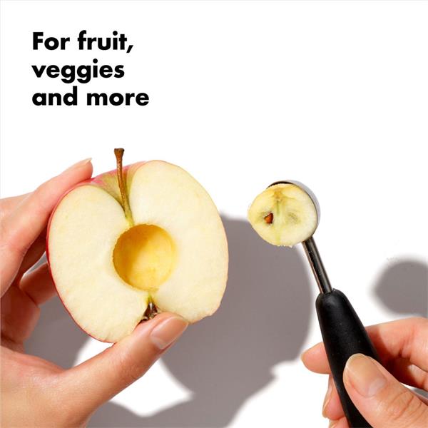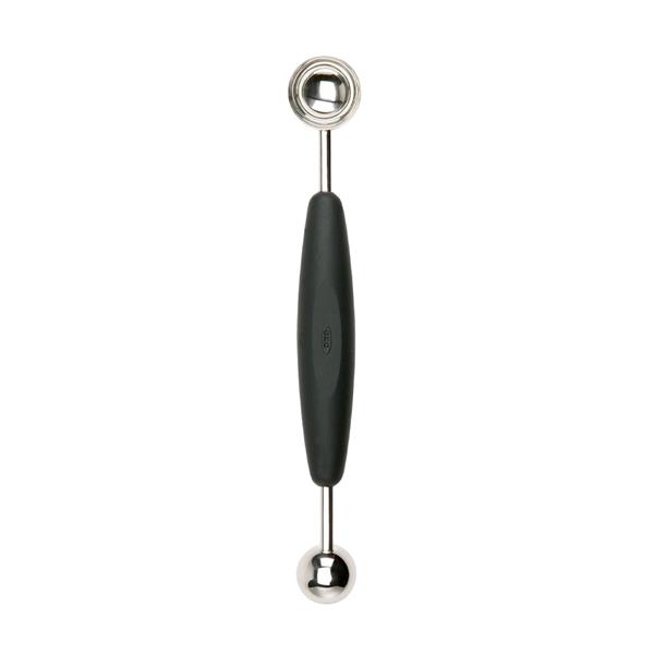 The OXO Good Grips Double-Sided Melon Baller is a versatile kitchen essential featuring two stainless steel scoop sizes (1" and 1.25"), ideal for creating uniform fruit balls, coring apples, or removing seeds from vegetables. Its soft, non-slip handle provides a secure and comfortable grip, even when wet, while the sturdy stainless steel scoops glide through food effortlessly.