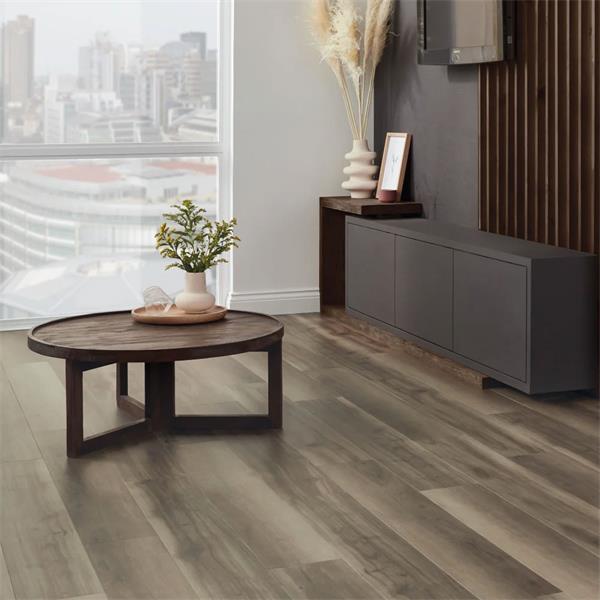 This flooring has a 0.55mm wear layer, a 6.5mm thickness, and a micro-bevelled edge. It has a slip resistance rating of R10, and comes with a 20-year residential warranty and a 15-year commercial warranty.