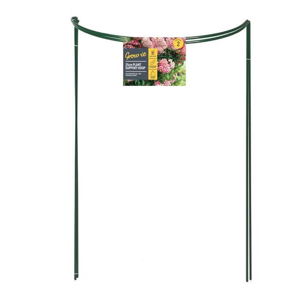 This Grow It Plant Support Hoop is perfect for maintaining borders or using two hoops together to create a sturdy plant support ring. It features a dark green plastic coating that blends effortlessly with foliage and is made from strong, durable steel. The added protective, rot-resistant plastic coating ensures long-lasting use. Sold in a pack of two.