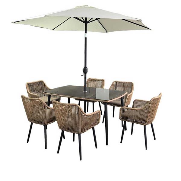 Each of the six ergonomically designed armchairs is hand-woven with premium, all-weather twisted rope wicker in a warm natural tone, ensuring a comfortable seating experience. Their breathable and UV-resistant material makes them perfect for outdoor use, allowing you to enjoy your dining experience regardless of the weather.