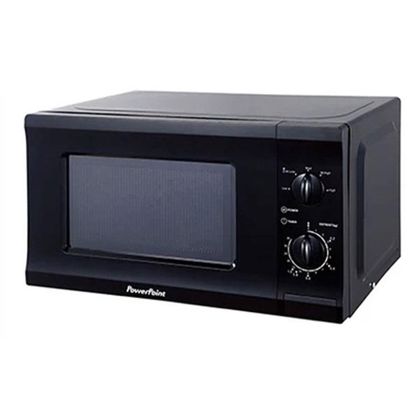 The PowerPoint is a compact and functional 700W black microwave oven, ideal for everyday cooking tasks. Its 20-litre capacity makes it suitable for smaller households or individuals. Operation is simple and intuitive thanks to the manual dial controls, allowing you to easily adjust the power level and set the timer for up to a specified duration. Beyond standard heating, it also offers a defrost function for conveniently thawing frozen food. The interior features a painted finish and a rotating glass turntable to ensure even cooking and heating of your meals. This model prioritises ease of use and practicality, making it a reliable appliance for quick and efficient meal preparation.