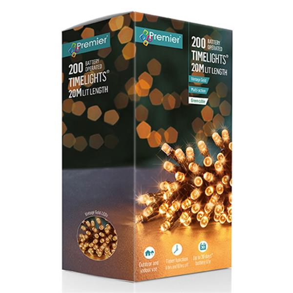 A perfect addition to your festive decor, this strand of 200 vintage-style gold LED lights provides a beautiful, warm glow. It also features a convenient, built-in timer for effortless operation.