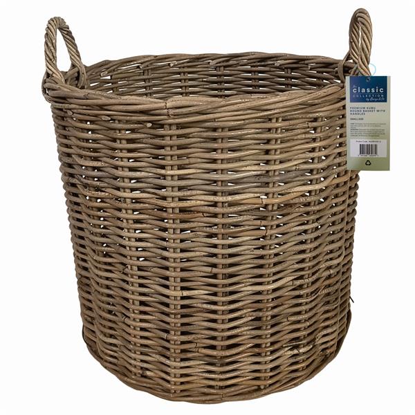 The Classic Collection Premium Kubu Round Basket with Handles (Small) is a charming and versatile storage accessory, ideal for adding a rustic yet refined touch to any living space. Handwoven from high-quality Kubu rattan, the basket showcases a beautiful greyish-brown colour, a natural characteristic of the material, which blends seamlessly with various décor styles. Its compact, round shape and sturdy construction make it perfect for a range of uses, from holding kindling and firelighters by the fireplace to organising blankets, magazines, or children's toys. The two integrated handles are expertly woven into the design, providing a comfortable and secure grip for easy carrying. This small basket combines a timeless aesthetic with functional design, making it a stylish and practical solution for clutter in a cosy home.