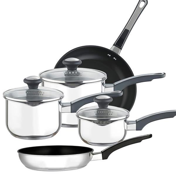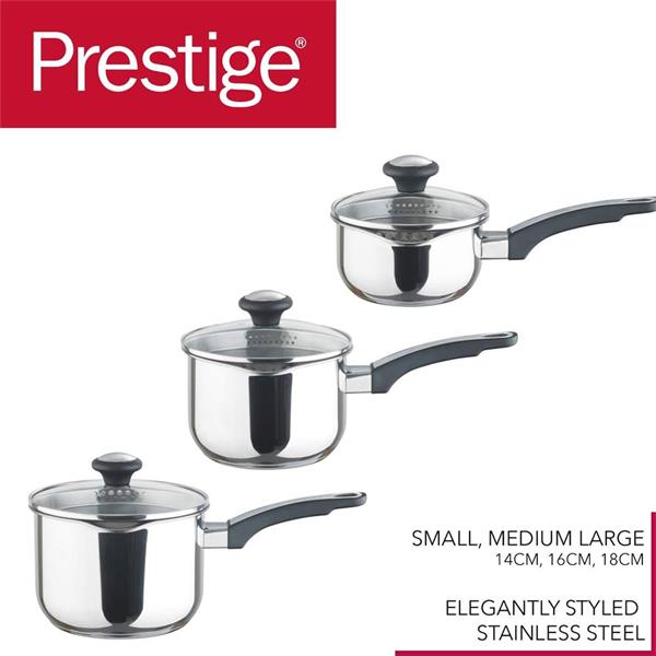 Stainless steel pan set – This robust Prestige stainless steel cookware set features a 14cm, 16cm, and 18cm saucepan, each with a glass lid, along with a 20cm and 24cm non-stick frying pan set.