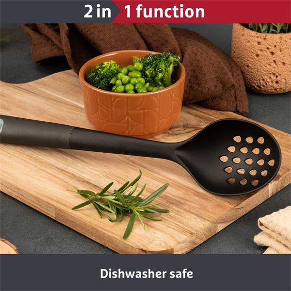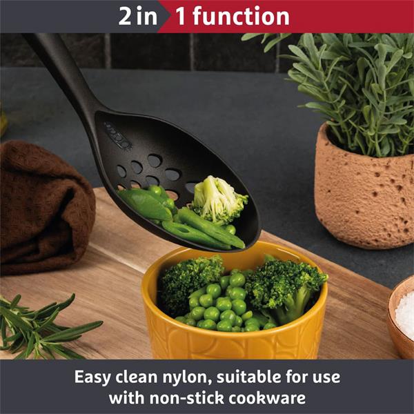 It features durable nylon heads that are gentle on non-stick cookware yet tough enough for daily use. The integrated drainage holes make it ideal for easily lifting and draining vegetables, pasta, or fried foods. With a soft-touch handle, it's ergonomically designed for a secure, comfortable grip and maximum control. Plus, it's heat resistant up to 210°C and dishwasher safe for effortless cleaning and maintenance.