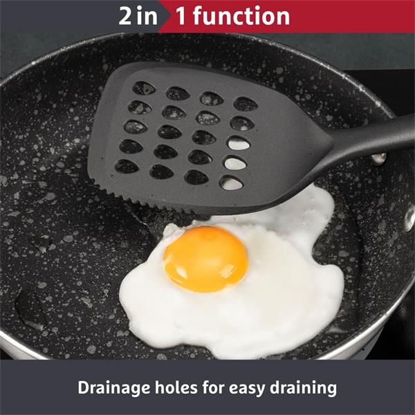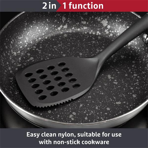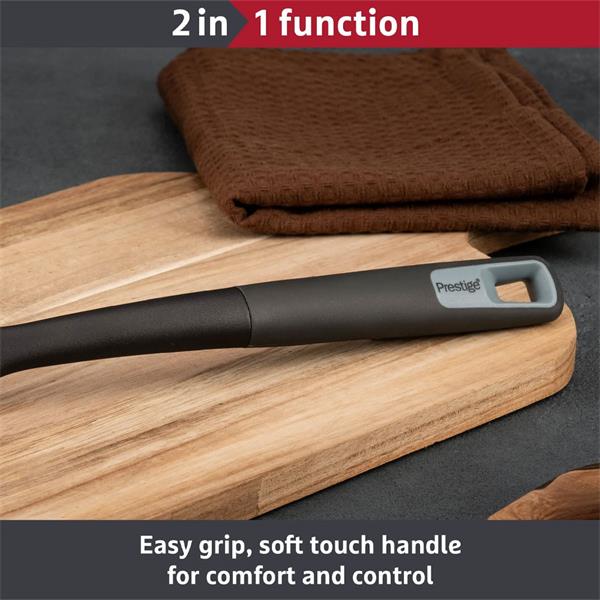 The Prestige Slotted Turner Drainage & Serrated combines multiple functions into a single, indispensable tool for any kitchen. Its main feature is a slotted head, expertly designed to drain excess liquids and fats from foods, making it ideal for flipping fried eggs, fish, or sausages. The head's edge is also serrated, providing a sharp, saw-like surface that can effortlessly cut through delicate foods like lasagne or quiche right in the pan, eliminating the need for a separate knife. With a solid, comfortable handle and a design that prioritises both durability and efficiency, this versatile turner streamlines cooking and serving by reducing the number of utensils needed.