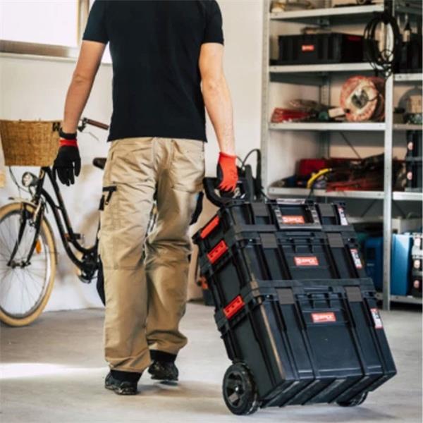 The Qbrick System PRO Set 3-in-1 is a professional-grade, modular mobile workshop designed for maximum organisation and durability in demanding environments. This versatile 3-piece set includes the PRO Cart 2.0 with its telescopic aluminum handle and large rubber-coated wheels for effortless transport, the mid-sized PRO Toolbox 2.0 for larger power tools, and the compact PRO Organiser 100 for secure small-part management. Rated IP54 for water and dust resistance, each module features polyamide side connectors for seamless stacking and impact-resistant polycarbonate lids, ensuring your equipment remains protected and accessible on even the toughest job sites.